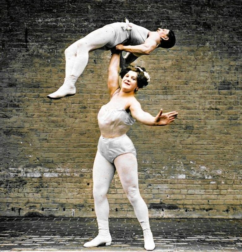 Цирковая силачка Кейт Брумбах, больше известная, как Великая Сандвина (1884 — 1952) поднимает своего мужа над головой