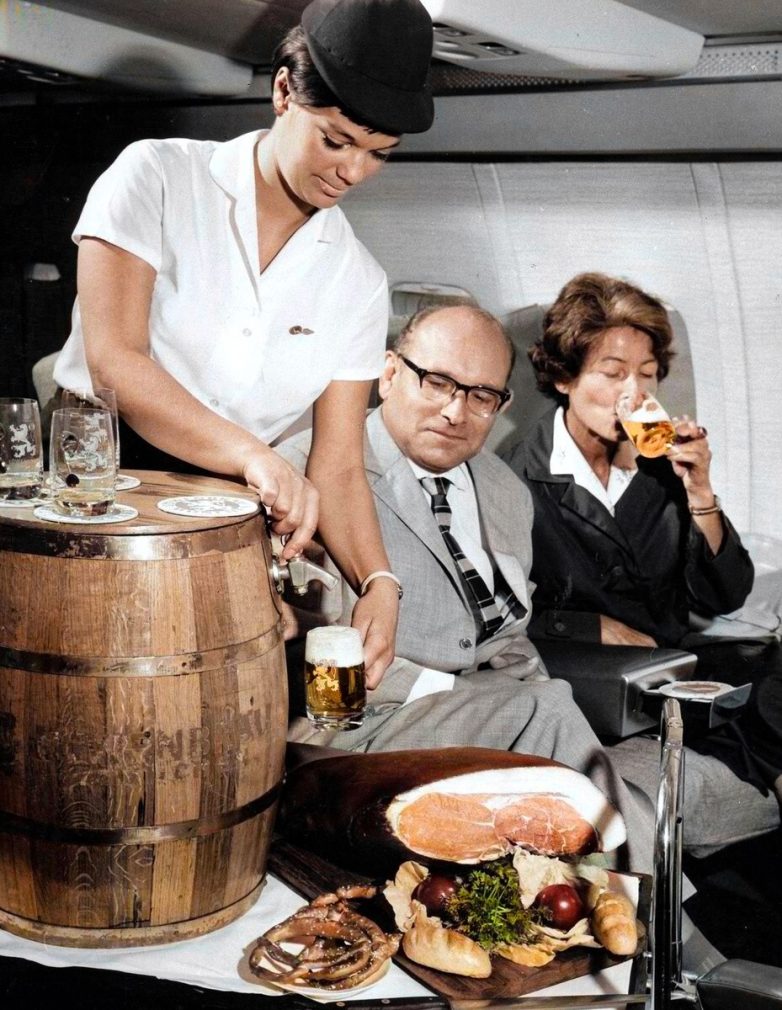 На фото бортпроводник наливает свежее бочковое пильзенское пиво для пассажиров Boeing 707. Такая традиция была в 1960-е годы на рейсах авиакомпании Lufthansa.