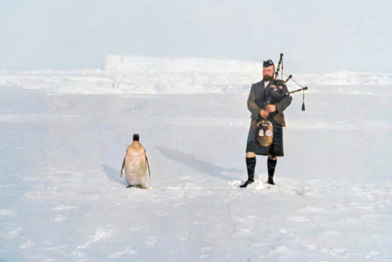 Гилберт Керр, член шотландской Национальной антарктической экспедиции, играет на волынке для пингвина, 1904 год
