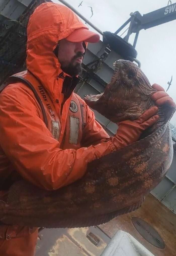 Рыбак с глубоководным угрем-волком