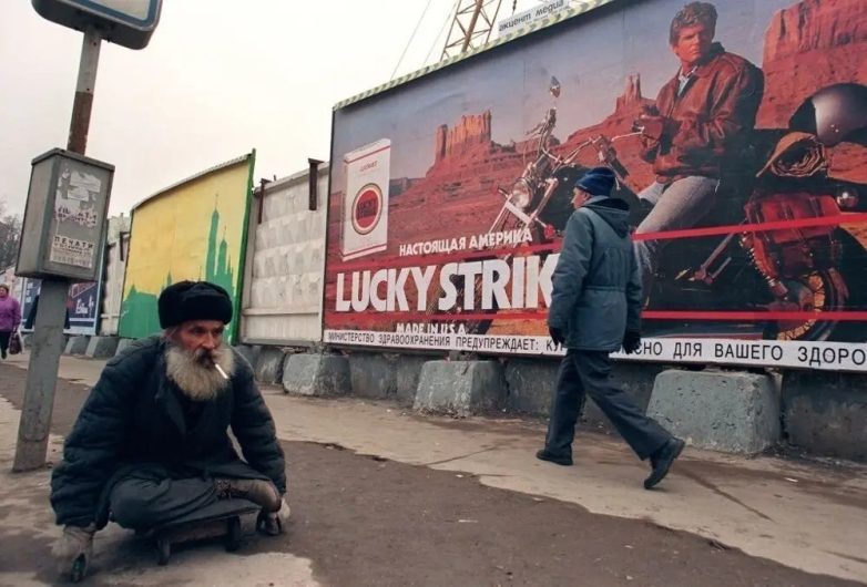 Инвалид на фоне рекламы сигарет «Lucky Strike». Россия, 1990-е годы.