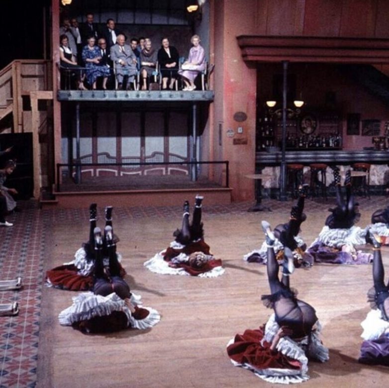Советский лидер Никита Хрущев во время своего визита в США наблюдает из ложи танец канкан, 1959 год.