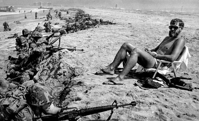 Морские резервисты, которые отрабатывают высадку десанта в Коронадо, и невозмутимый мужчина на отдыхе. 22 июня 1978 года.