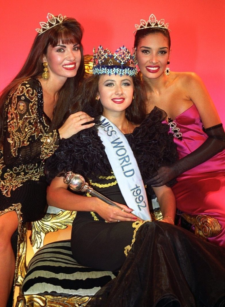 «Мисс мира – 1992» 18-летняя Юлия Курочкина в центре рядом с Клэр Смит «Мисс Великобритания» и Фрэнсис Гаго «Мисс Венесуэла», 12 декабря 1992 г.