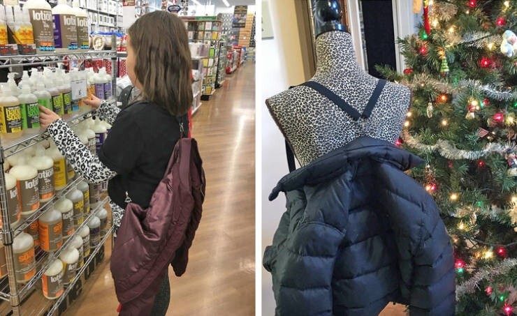 Если вы захотите снять куртку, когда заходите в общественное помещение, вам просто нужно вытащить руки из рукавов. Куртка будет держаться на подтяжках за спиной как рюкзак.