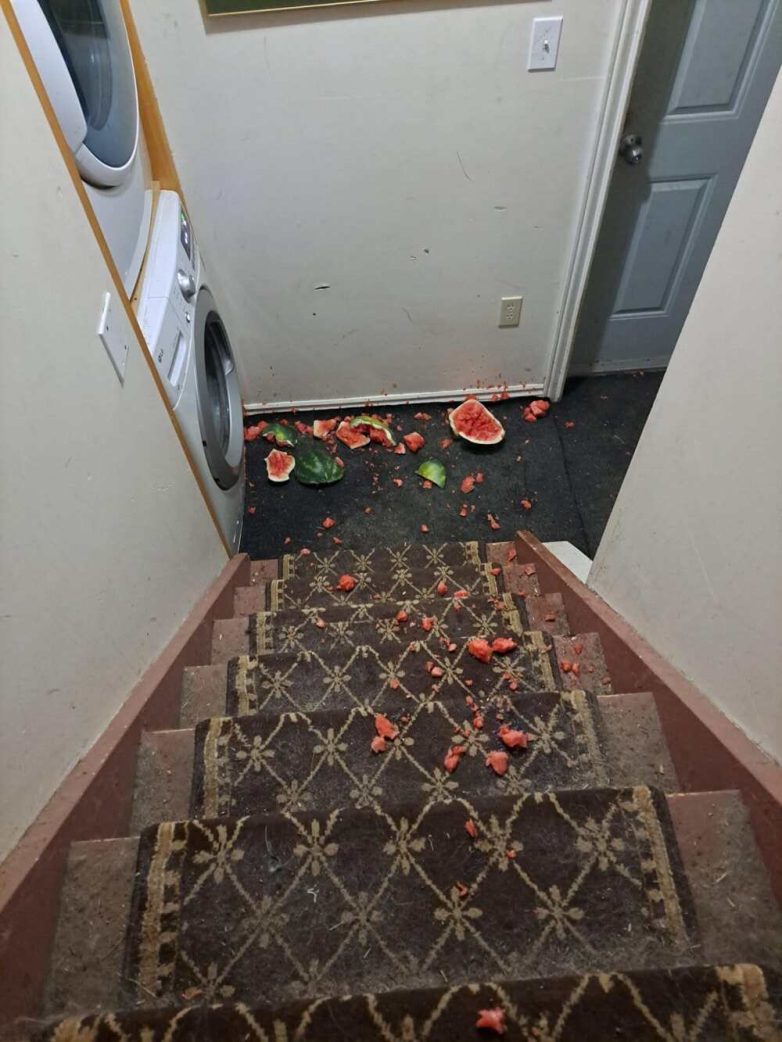 Если ваш холодильник настолько же «чист», как и лестница, то понятно, почему арбуз спланировал побег.