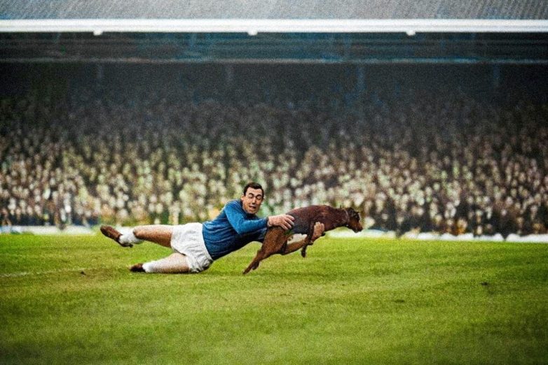 Вратарь «Лестер Сити» Гордон Бэнкс ловит выбежавшую на поле собаку во время матча английской премьер-лиги с «Манчестер Юнайтед», Англия, 1965 год.