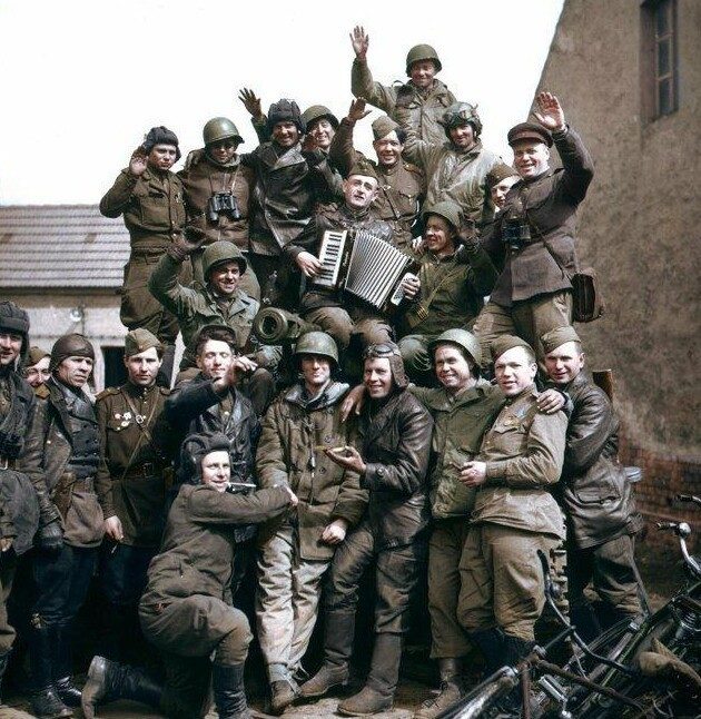 Советские солдаты и солдаты союзников, в честь победы над Германией, 1945 год