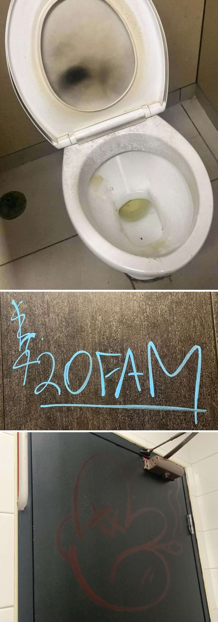 «Пришел сегодня утром на работу и обнаружил, что кто-то поджег наш туалет и оставил граффити на стенах»
