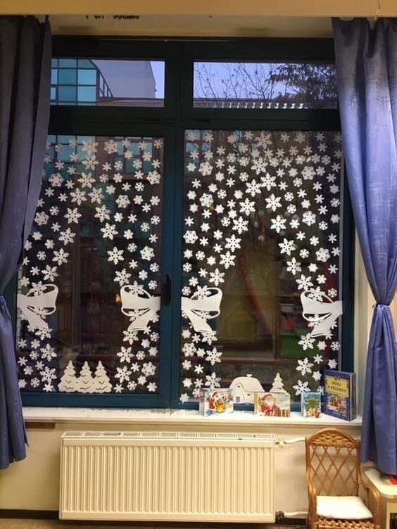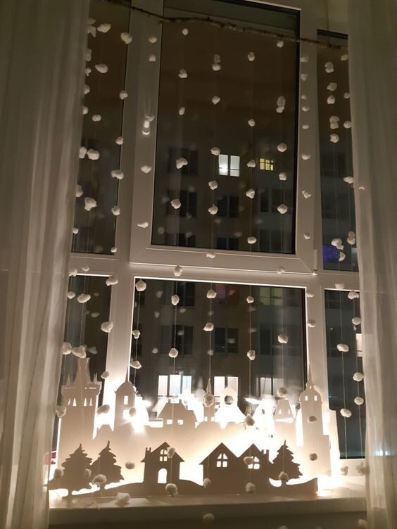Вырезанные фигуры из бумаги или картона — это еще один интересный вариант для декора окон. Можно сделать целые сценки с лесными животными, снежными городками или даже создать новогоднюю композицию.Как использовать: