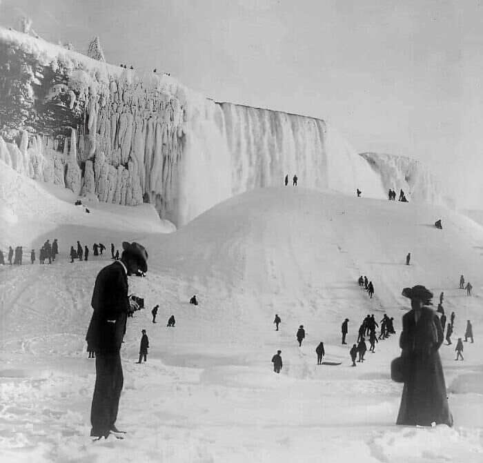 Люди катаются на замерзшем Ниагарском водопаде в зимние месяцы, 1911 год