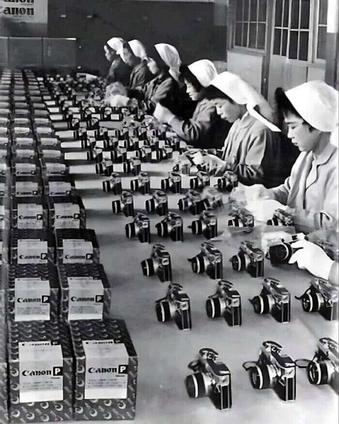 Женщины на работе на фабрике Canon, Япония, 1959 год