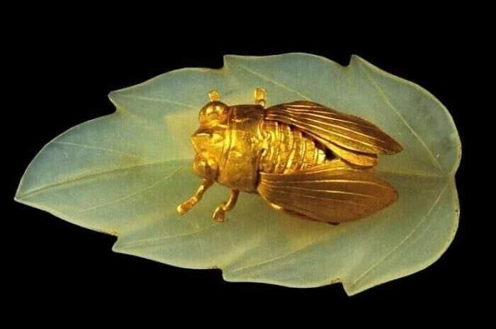 14. Золотая Цикада на нефритовом листе, династия Мин, 1368-1644 года. Была обнаружена в гробнице в 1954 году. Это заколка для волос, принадлежавшая высокопоставленной женщине