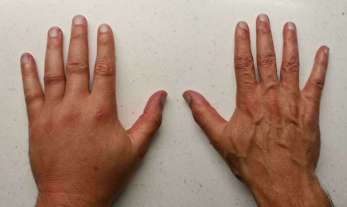 Опухшая левая рука после укуса насекомого по сравнению с нормальной правой рукой