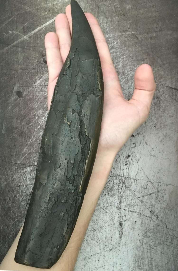 Размер слепка зуба тираннозавра по сравнению с человеческой рукой