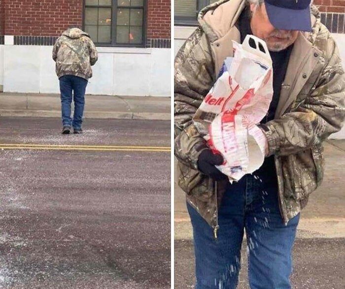 «Ребята… Это мой папа. Он приехал ко мне на работу и ждал, пока я приеду, чтобы насыпать дорожку из соли от моей машины до входной двери в здание, чтобы я, его 38-летняя дочь, не поскользнулась и не упала на льду… Люблю тебя, папочка».