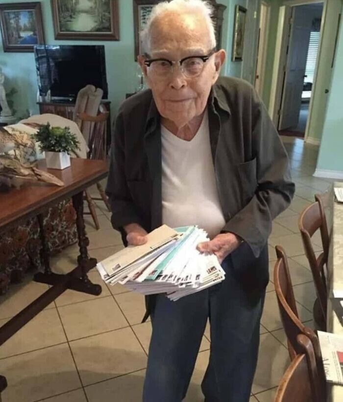 «Это мой дедушка, когда ему исполнилось 100 лет. Посмотрите, сколько у него поздравительных открыток!»