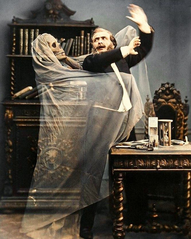 Фотография французского иллюзиониста Анри Робина с «привидением» в технике двойной экспозиции, 1863 год.