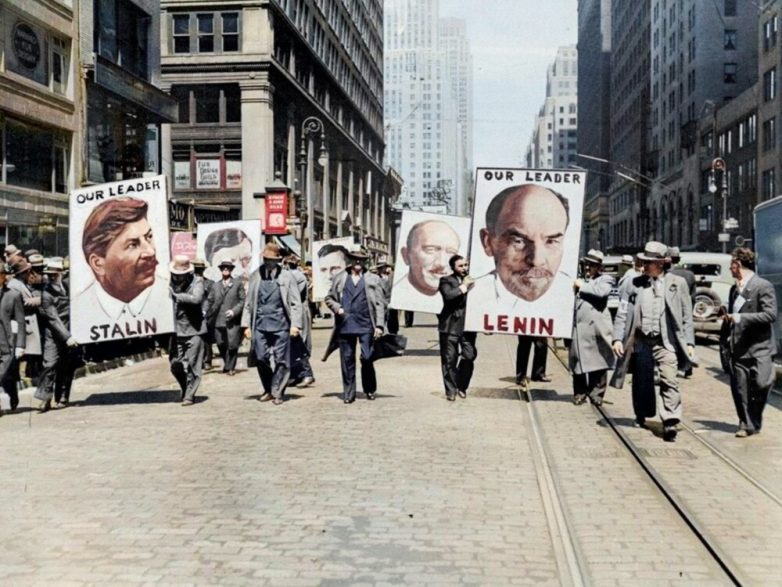 Марш коммунистов в честь Первого мая в самом центре в Нью-Йорка. США, 1935 год.В 1930-е годы коммунистическое движение в США развивалось весьма быстро, пока правящие круги США не развернули преследование коммунистов.