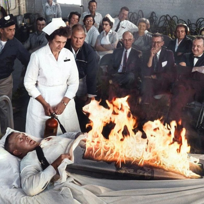 Начальник службы охраны труда и техники безопасности Клиффорд Робертс выступает в качестве модели во время курса противопожарной подготовки для сотрудников больницы McGuire.