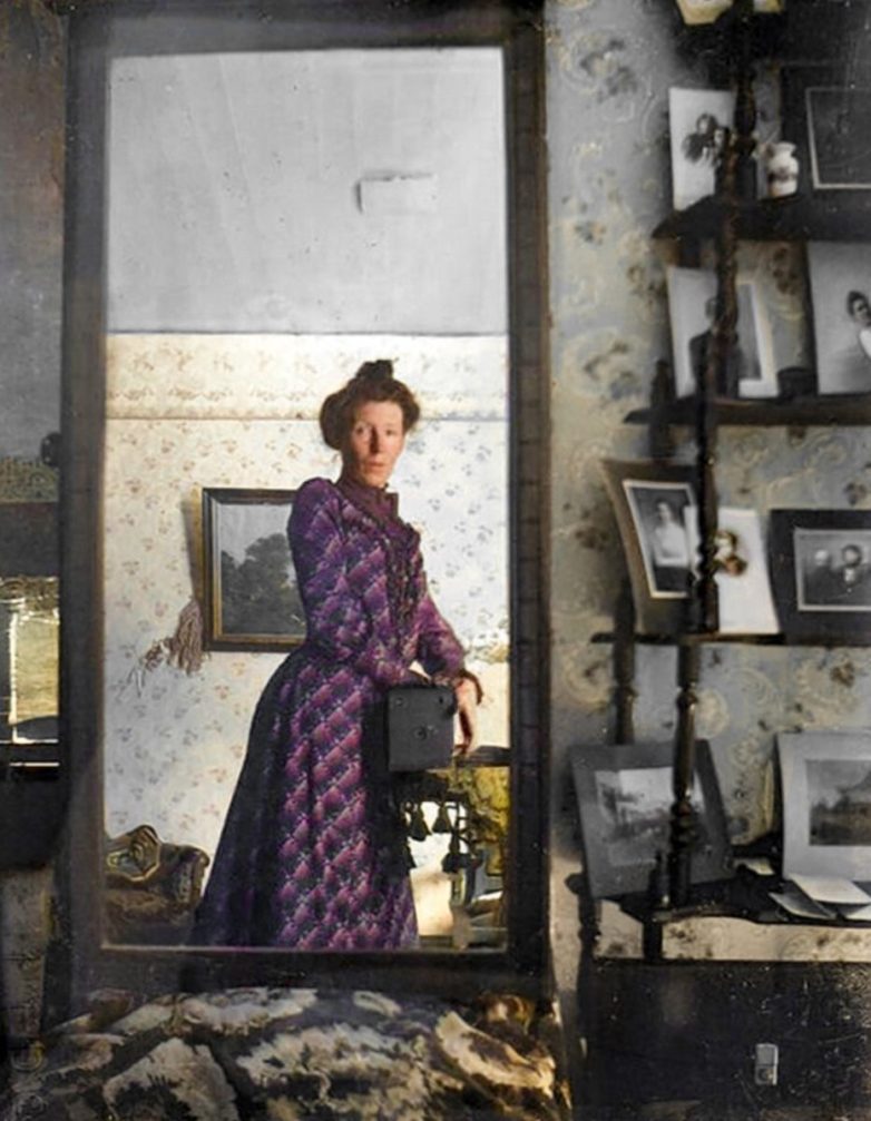 Женщина делает автопортрет в зеркале с помощью фотоаппарата Kodak Brownie в 1900 году.
