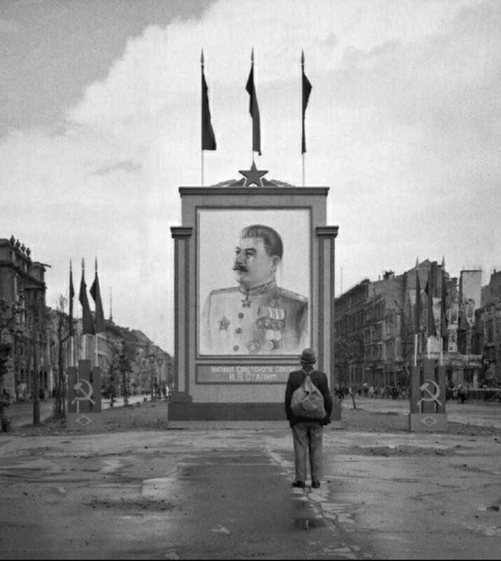 Июнь, 1945 года, Берлин, ошалевший немец смотрит на портрет Сталина — еще некоторое время назад он был уверен, что весь мир будет смотреть на портреты Гитлера