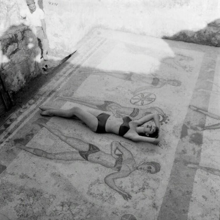 Девушка в бикини на знаменитой мозаике «Девушки в бикини «древнеримской виллы «Romana del Casale», Сицилия, 1955 год