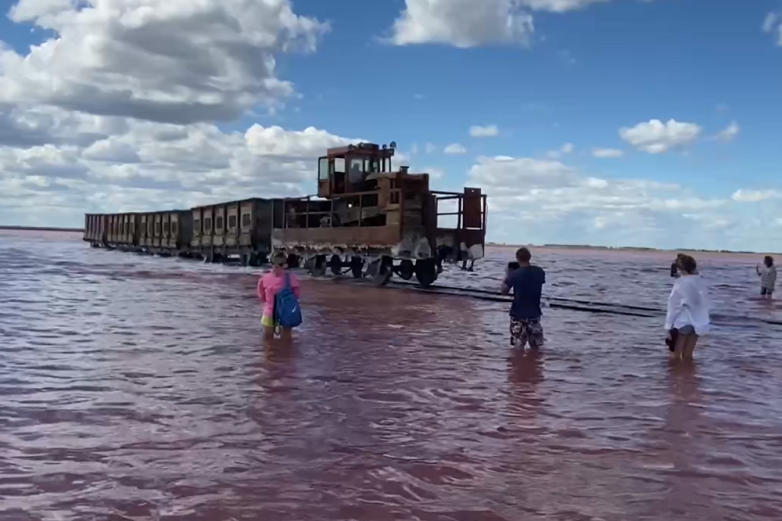 Озеро Бурсоль, которое также известно под названиями Розовое и Бурлинское, находится в Кулундинской степи Алтайского края. Летом водоём становится розовым в буквальном смысле благодаря микроорганизмам и особой водоросли. Практически по дну водоёма идут рельсы, а поезд везёт добываемую соль, концентрация которой здесь колоссальная и превышает 200 граммов на литр, к берегу.