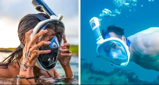 Эта маска была разработана, чтобы сделать дыхание под водой легким и естественным. Это позволяет пользователям дышать носом и ртом под водой, и наслаждаться беспрепятственным обзором на 180 градусов.