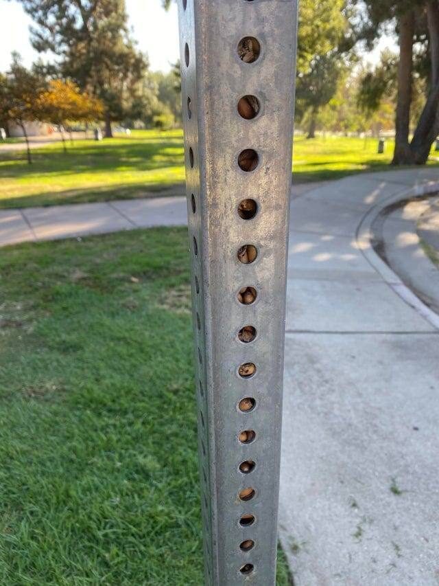 2. Белка полностью набила желудями столб с дорожным знаком на зиму