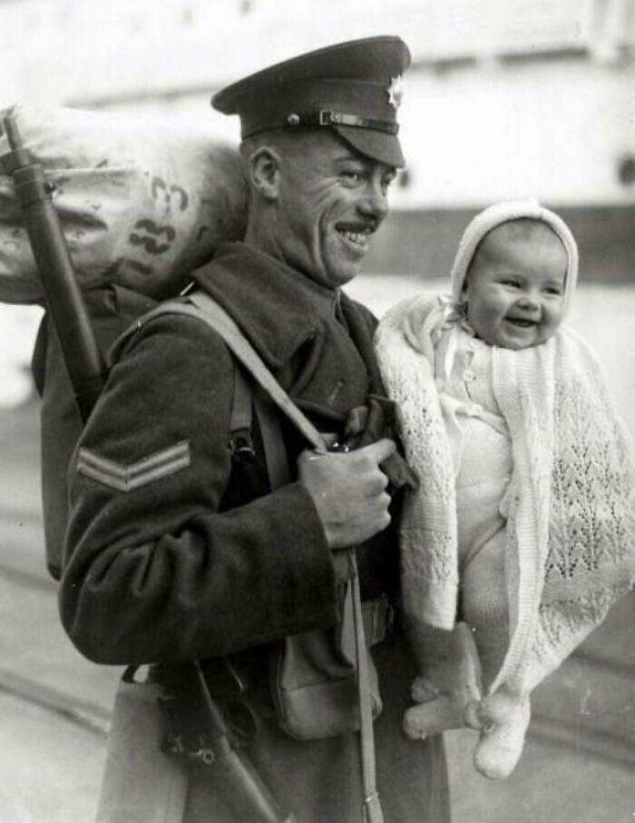 Возвращение домой. Британский солдат со своей 8-месячной дочерью на причале после возвращения из-за границы, 1945 год