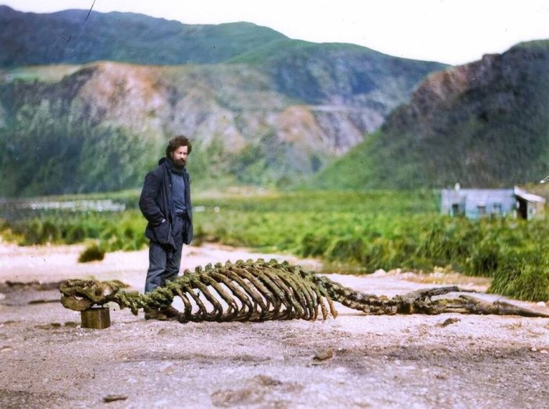 Учёный Австралазийской антарктической экспедиции Гарольд Гамильтон позирует со скелетом морского льва, 1913 год.