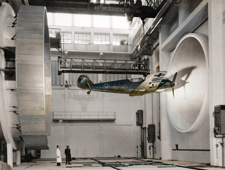 Испытания истребителя Мессершмитт BF.109 в Большой аэродинамической трубе в Берлине.