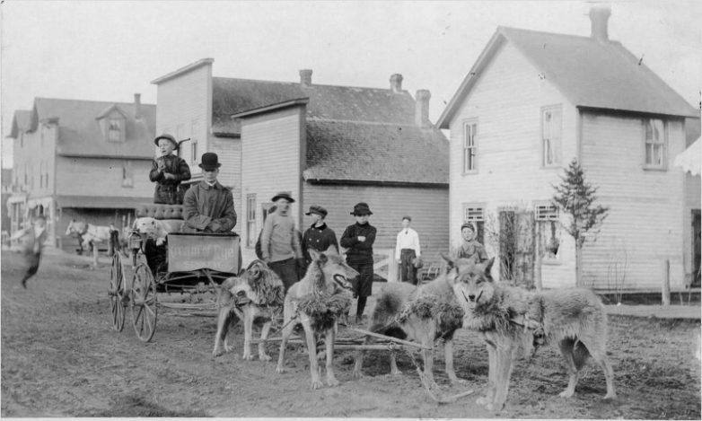 Ездовые волки, выращенные с щенков, запряжены в повозку. США, 1890-е годы