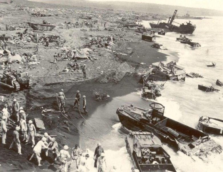 Выгрузка морской пехотой США снаряжения на острове Иводзима. Вторая мировая, февраль 1945
