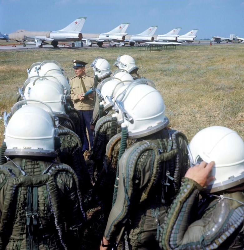 Прошлый век в редких фотографияхЛетчик первого класса, майор Юрий Козлов проводит инструктаж с молодыми пилотами перед высотным полетом, 1970 год