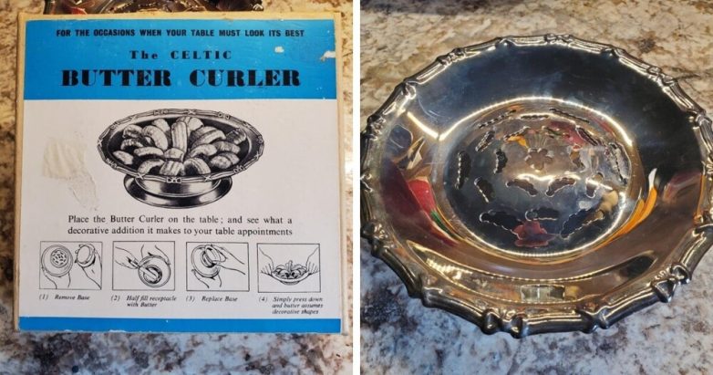 Работает это примерно так: блюдо разбирается, заполняется маслом, затем соединяется. Остаётся только надавить, и масло вылезает через декоративные фигурные отверстия.