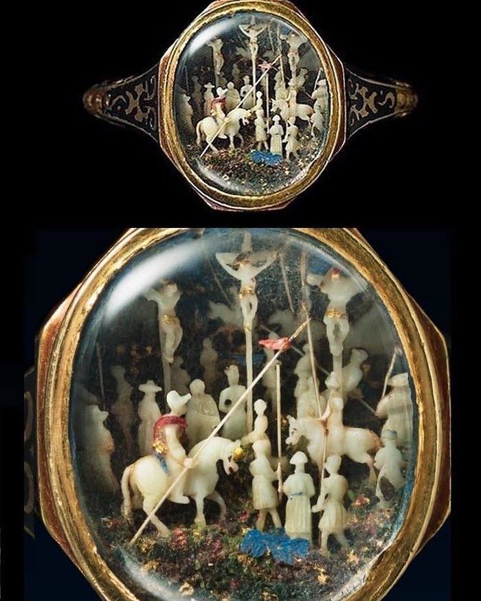 5. На этом кольце, изготовленном примерно в 1620 году н. э, изображена миниатюрная сцена распятия, полностью выполненная из слоновой кости. Возможно, оно было изготовлено во Франции или Испании