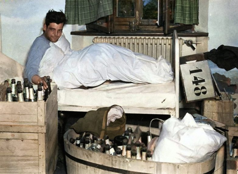 Капитан Льюис Никсон страдает от похмелья после празднования Дня Победы в гитлеровском «Орлином гнезде», 1945 год.