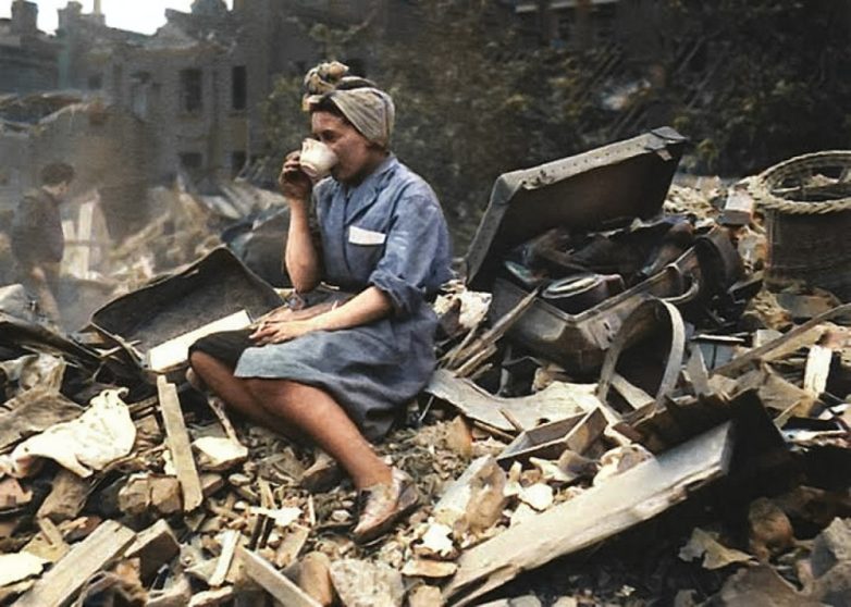 Женщина пьет чай на руинах своего дома после бомбардировки Лондона, 1940 год.