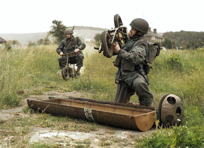 Британский парашютист вынимает складной мотоцикл Welbike из контейнера во время учений 3-й парашютно-десантной бригады, 1943 год Всего было выпущено 3853 таких складных мотоциклов. Предназначался для специальных операций, например «Маркет Гарден». Его можно было сбросить на парашюте, упаковав в цилиндрический контейнер диаметром 38 см.