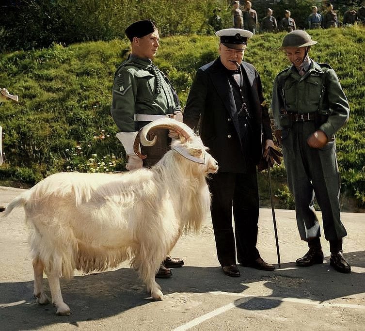 Уинстон Черчилль знакомится с козлом Билли, талисманом полка королевских Уэльских фузилеров, 1943 год.