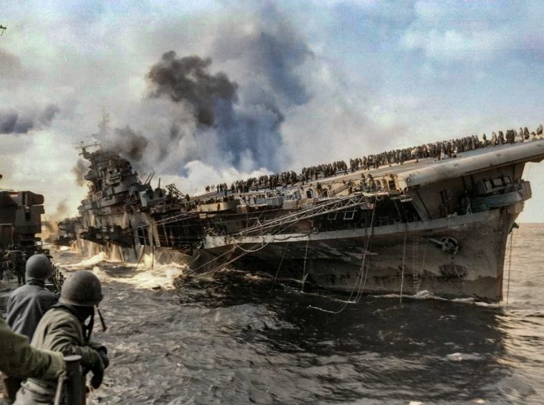Снимок сделан с корабля «Санта Фе», стоящего рядом с накренившимся авианосцем «Франклин», который получил повреждения во время боя за Окинаву. Эти повреждения получены в результате одной-единственной атаки одного японского самолёта, сбросившего всего 2 бомбы. Первая пробила взлётную палубу перед главной надстройкой, и вызвала детонацию топлива и БК подготавливаемых к взлёту самолётов. Вторая повредила кормовую часть, пробив две верхних палубы и взорвавшись внутри. По числу погибших моряков потери на Франклине (CV-13) на втором месте после линкора «Аризона» (BB—39) в Пёрл-Харбор.