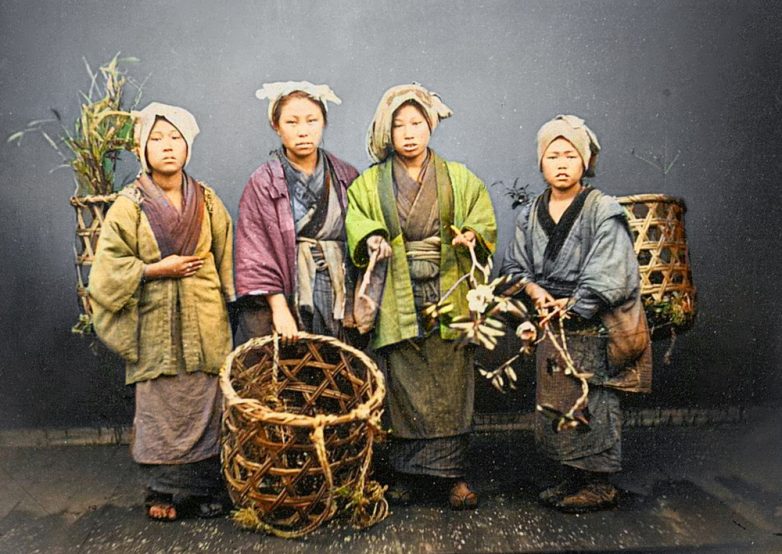 Группа крестьянских девушек в повседневной одежде. Япония, 1880 год.