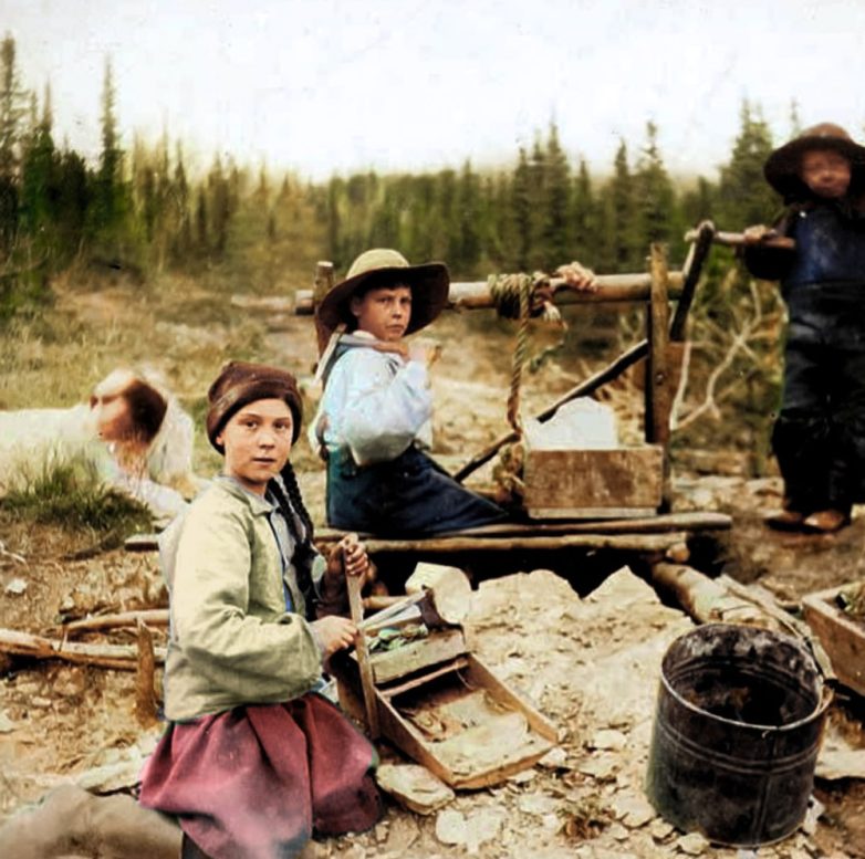Трое детей просеивают песок на золотом руднике в Доминион-Крик, одна из которых пробабуля Греты Тунберг.