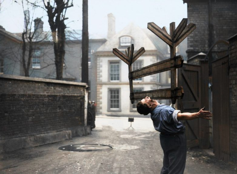 Помощница шляпника стоит на полях цилиндра, чтобы показать его прочность. Лондон, 1925 год.