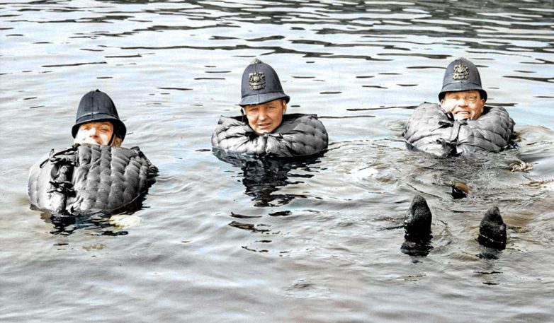 Трое полицейских испытывают спасательные жилеты в лондонском порту, 1930 год.