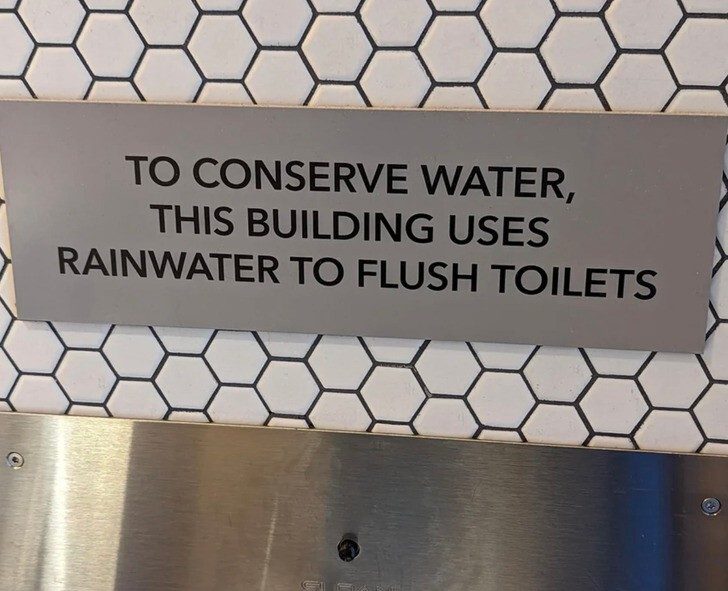 16. Табличка в гостиничном туалете в Миннеаполисе. «В этом здании для туалета используется дождевая вода»