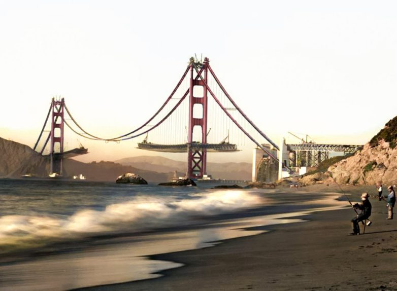Мужчины рыбачат на фоне строящегося моста Золотые Ворота в Сан-Франциско в 1930-е годы.