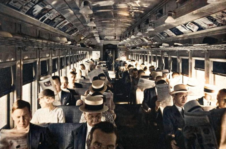 Пассажиры в Нью-Йорке читают газеты по пути на работу, ок. 1920